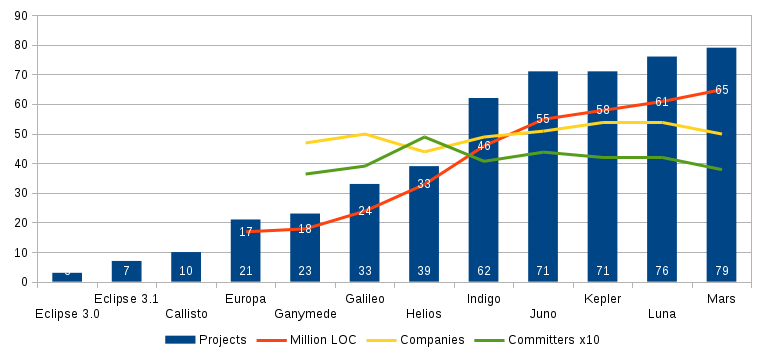 In June 2014 the Eclipse community shipped Luna, its ninth annualsimultaneous release. Including previous releases of the EclipsePlatform, this was the eleventh release that was shipped on time tothe day. Seventy six projects participated in the Luna simultaneousrelease, comprising 61 million lines of code, and produced by 420committers from 54 member companies.