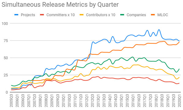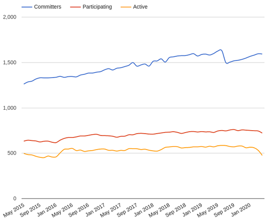 In late 2018 and through much of 2019, we engaged in a process to update our committer agreements. This required that we engage with all of our member companies and individual committers to get them to sign new documents. At the end of this multiple-month process, we were forced to retire those committers that we either could not contact, or could not get to sign the new agreement. This accounts for the step drop that we see in our committer numbers in the summer of 2019.